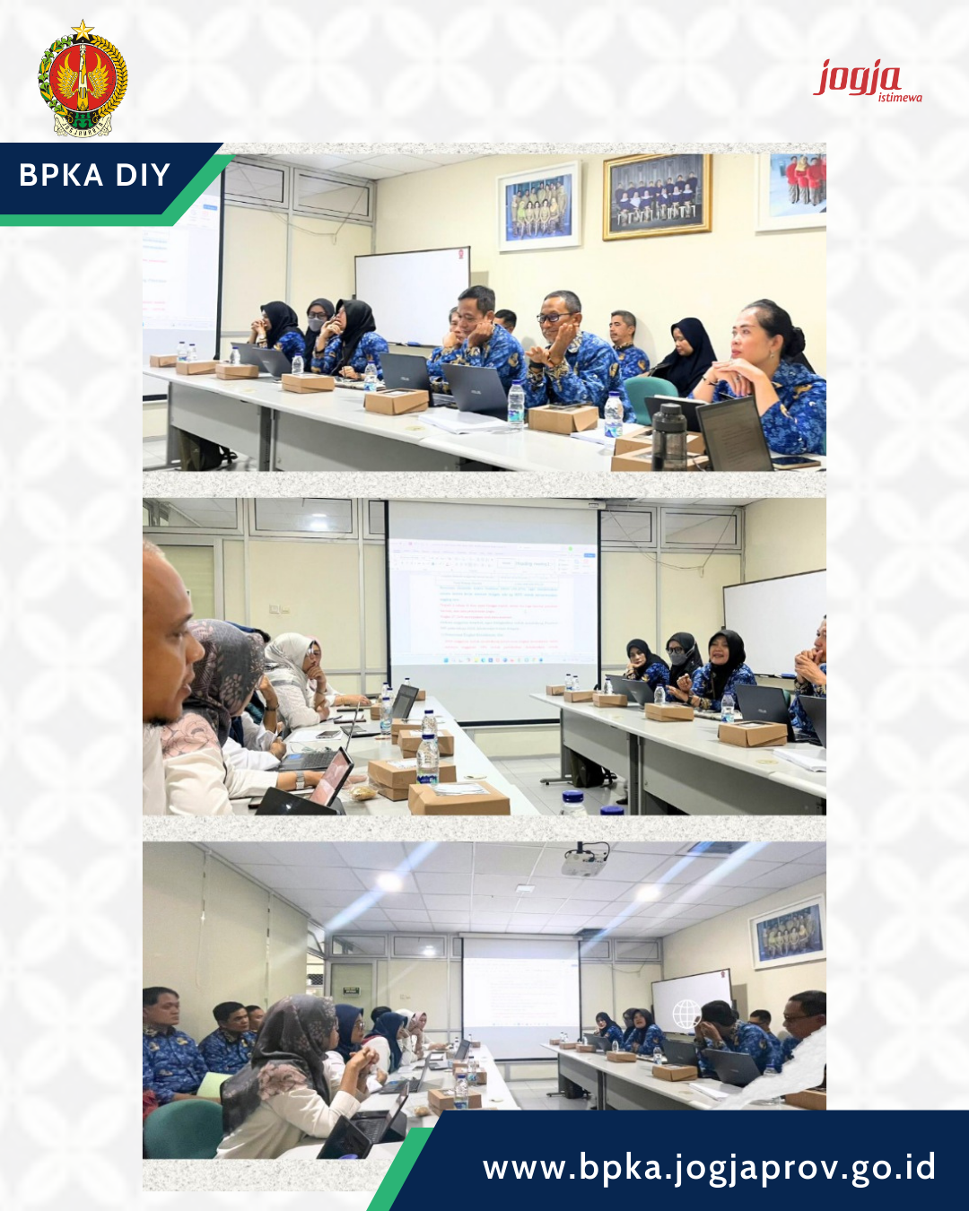 BPKA DIY secara maraton telah selesai melaksanakan tugas Gubernur selaku wakil Pemerintah untuk melakukan Evaluasi atas Rancangan Peraturan Daerah pada Pemerintah Kabupaten/Kota di Daerah Istimewa Yogyakarta tentang Anggaran Pendapatan dan Belanja Tahun 2026 mulai tanggal 11 Desember 2025 sampai dengan 18 Desember 2025 dengan urutan Pemerintah Kota Yogyakarta, Pemerintah Kabupaten Gunungkidul, Pemerintah Kabupaten Kulon Progo, Pemerintah Kabupaten Bantul dan Pemerintah Kabupaten Sleman.