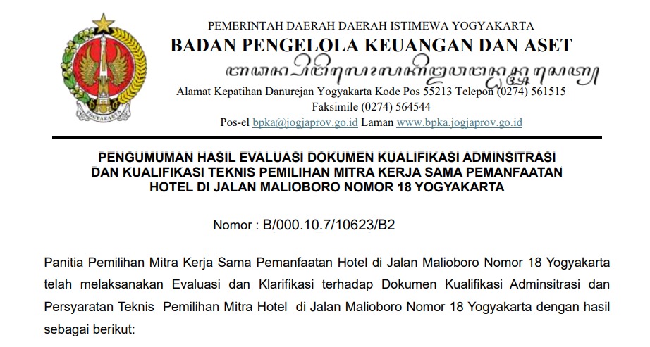 Berdasarkan Pengumuman Nomor B/000.10.7/10623/B2 tentang PPengumuman Hasil Evaluasi Dokumen Kualifikasi Adminsitrasi Dan Kualifikasi Teknis Pemilihan Mitra Kerja Sama Pemanfaatan Hotel Di Jalan Malioboro Nomor 18 Yogyakarta, Panitia Pemilihan Mitra Kerja Sama Pemanfaatan Hotel di Jalan Malioboro Nomor 18 Yogyakarta telah melaksanakan Evaluasi dan Klarifikasi terhadap Dokumen Kualifikasi Adminsitrasi dan