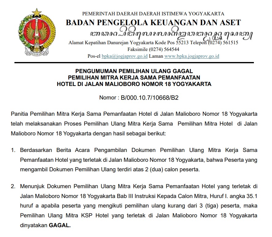Pengumuman Hasil Evaluasi Dokumen Kualifikasi Adminsitrasi Dan Kualifikasi Teknis Pemilihan Mitra Kerja Sama Pemanfaatan Hotel Di Jalan Malioboro Nomor 18 Yogyakarta